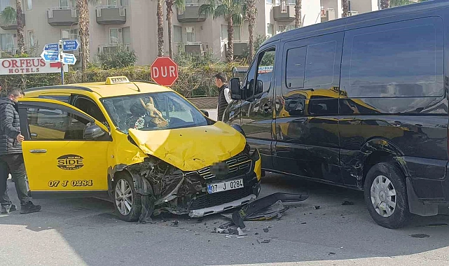 Antalya'nın Manavgat ilçesinde ticari taksi ile minibüsün çarpışması sonucu meydana gelen kazada, taksi şoförü ve 2 İngiliz turist yaralandı. Kaza güvenlik kamerasına saniye saniyesine yansıdı.