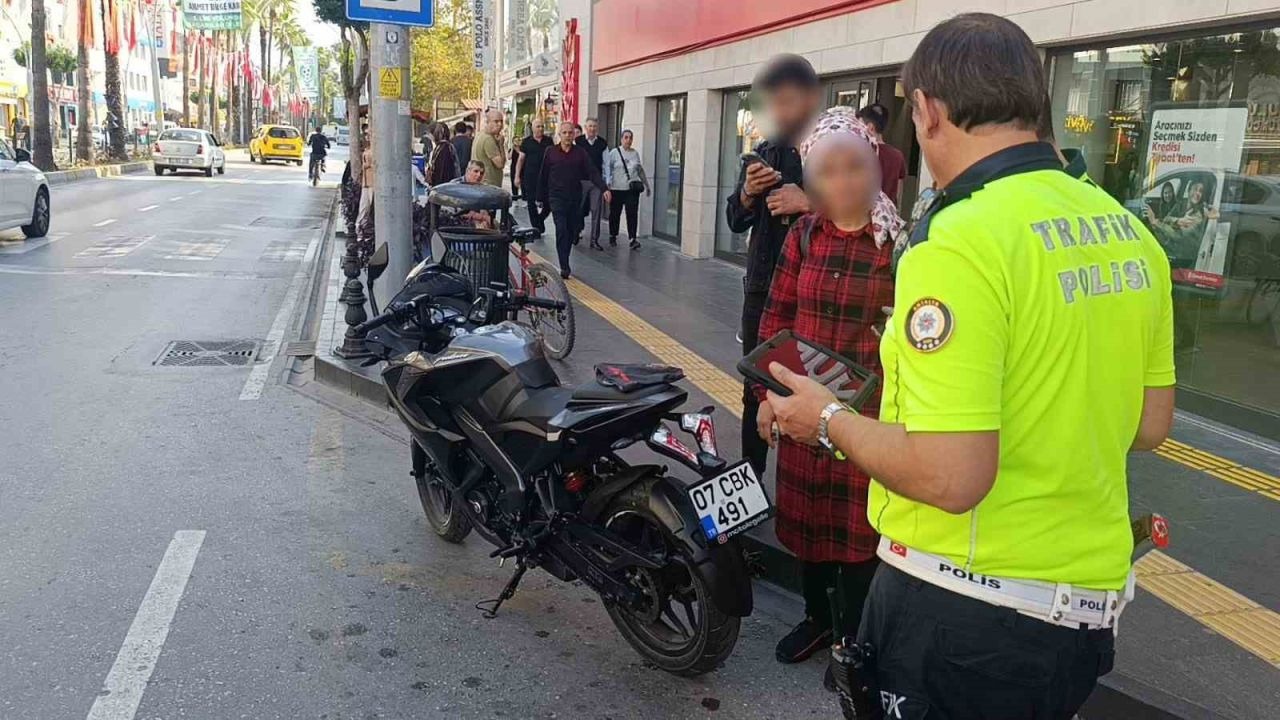 Antalya'nın Manavgat ilçesi Antalya Caddesi'nde devriye gezen Manavgat İlçe Emniyet Müdürlüğü Trafik Denetleme Büro Amirliği ekipleri, kuralları hiçe sayan bir motosiklet sürücüsünü tespit etti. Ekipler, seyir halindeki motosikletin plakasının bandana ile okunmayacak şekilde kapatılmış olduğunu fark ederek aracı durdurdu.