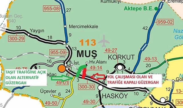 Muş-Havalimanı yolu, Karayolları 113. Şube Şefliği tarafından yürütülen yol yapım çalışmaları nedeniyle 14 Temmuz 2025 Salı günü saat 22.00 itibarıyla trafiğe kapatıldı.