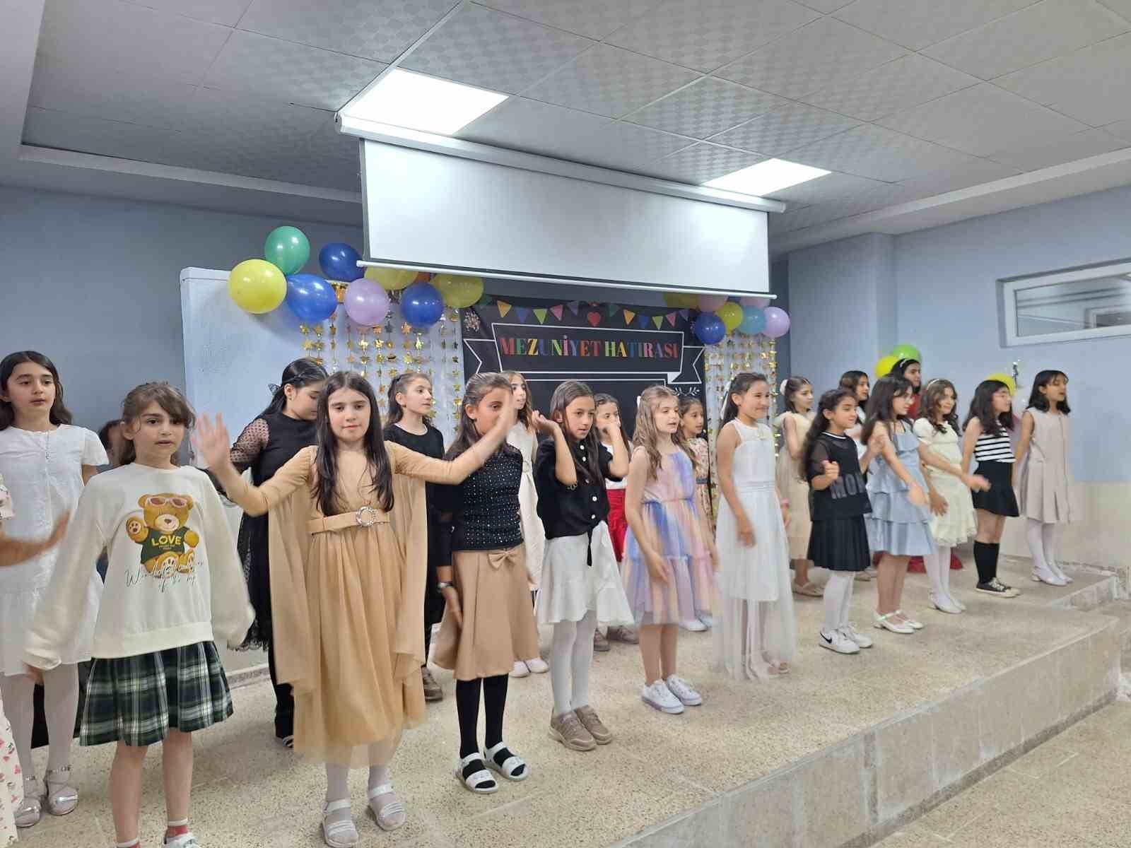 Muş Melikşah İlkokulu'nda düzenlenen mezuniyet töreninde minik öğrenciler diplomalarını alırken, veliler ve öğretmenler duygu dolu anlar yaşadı.