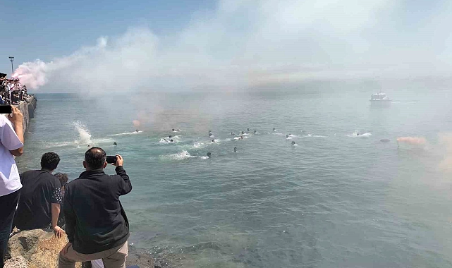 Öğrencilerin şapkalarını havaya atarak mezuniyetlerini kutladığı programda, şehitler anısına da denize çelenk bırakıldı. Mezun olan öğrenciler, denize atılan pet şişe içerisindeki diplomalarını yüzerek aldı.