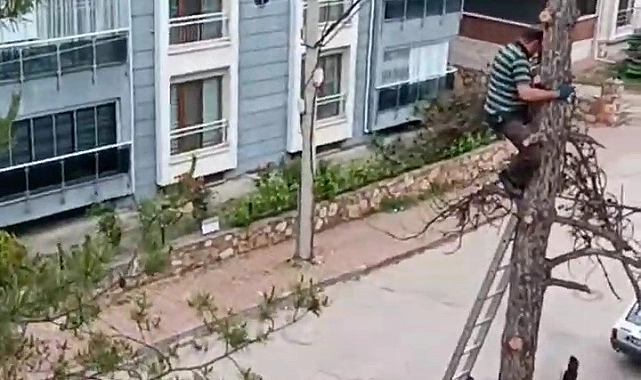 Olay Emek Mahallesinde meydana geldi. Bir kişi merdiven yardımı ile çıktığı ağacın dallarını budamaya başladı. Yaklaşık 9 metrelik yükseklikte iş güvenliği almadan yapılan tehlikeli çalışma yürekleri ağza getirdi.