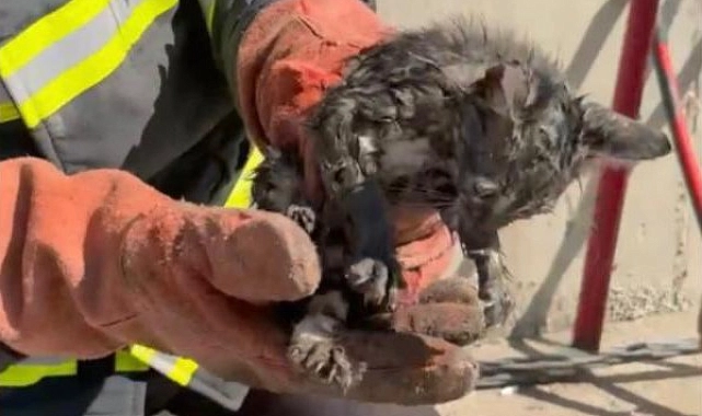 Osmaniye'de, Devlet Bahçeli Meydanı alt geçidindeki refüj demirinin içine sıkışan bir yavru kedi, itfaiye ekiplerinin titiz çalışması sonucu kurtarıldı.