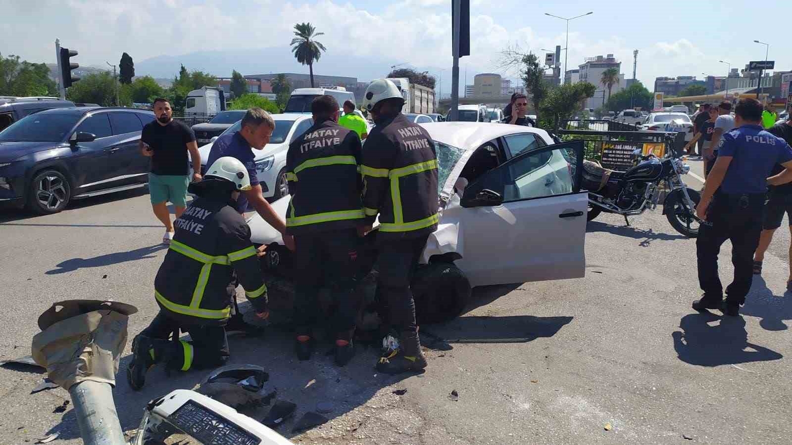 Edinilen bilgilere göre kaza, İskenderun ilçesi kent merkezinde yaşandu. İ.D'nin kullandığı 31 Z 6540 plakalı otomobil, İbrahim Karaoğlanoğlu Caddesi'nde M.T. idaresindeki 31 ARL 971 plakalı motosiklet ve H.G'nin sürdüğü bisiklete çarptı. Kontrolden çıkan otomobil, sinyalizasyon direğine çarparak durabildi. İhbar üzerine kaza yerine 112 Acil Sağlık, polis ve itfaiye ekipleri sevk edildi. Yaralanan M.T. ve H.G, sağlık ekibince İskenderun Devlet Hastanesine kaldırıldı.