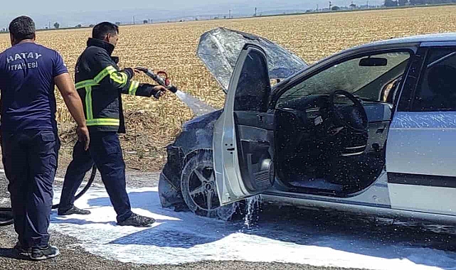 Hatay'da seyir halindeyken motor kısmı alev alan otomobilde hasar oluştu.