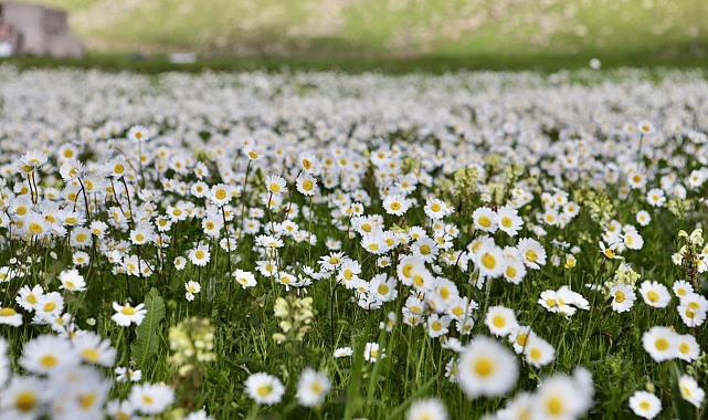 Papatya tarlasına dönüşen arazide çocuklar zaman zaman oyunlar oynarken, bölgeden geçenler ise fotoğraf çekerek görsel şöleni kaydediyor.