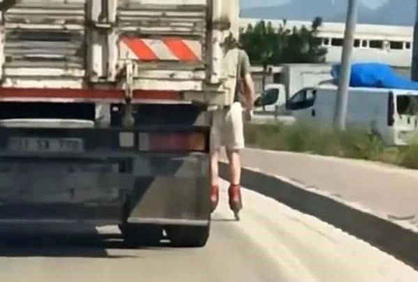 Çevre yolu Demirtaş mevkiinde kaskı ve korumalığı olmayan genç, anayolda seyir halindeki 31 SA 770 plakalı kamyonun yan kısmına tutundu. Anayol olmasına rağmen ilerlemeye devam eden gencin tehlikeli yolculuğu başka bir sürücü tarafından cep telefonuyla kaydedildi.