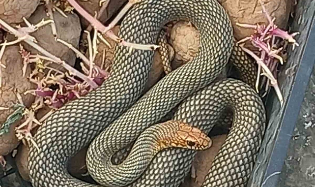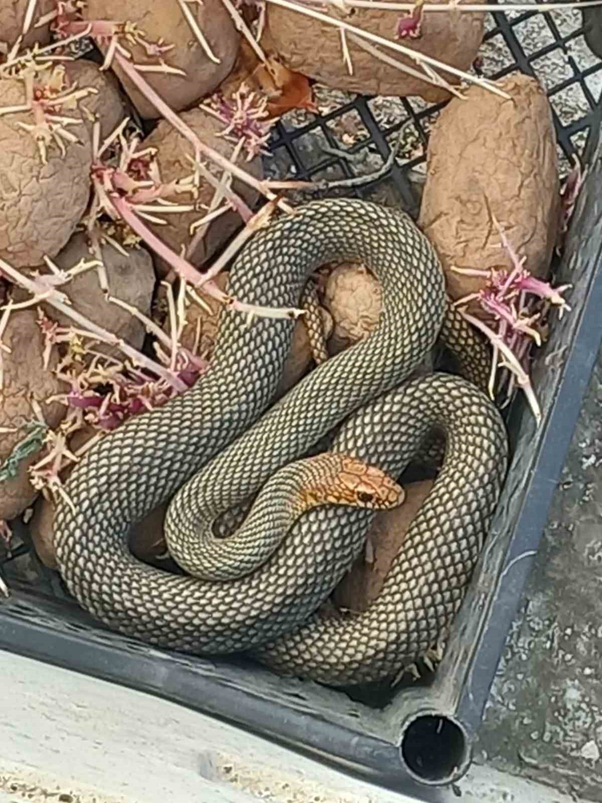 Bolu'da apartmanın önünde patates dolu plastik kasaya giren yılan, itfaiye ekiplerince bulunduğu yerden kurtarılarak doğaya bırakıldı.
