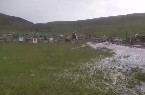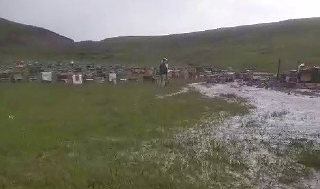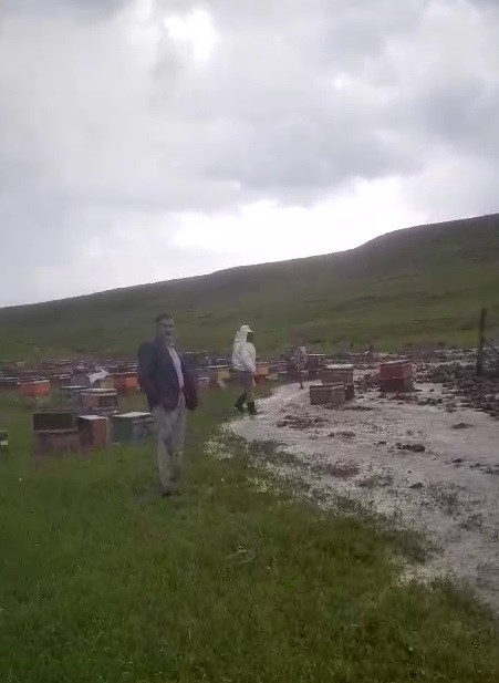 Erzurum'un Tekman ilçesinde etkili olan sağanak ve dolu, arı kovanlarına zarara verdi.