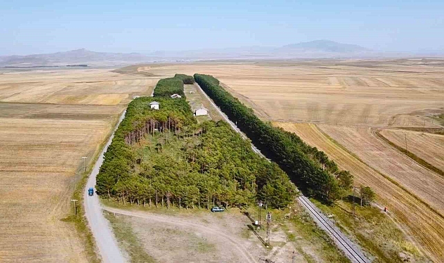 TCDD tarafından 1969 yılında Doğu Anadolu'daki tren yolları ile tren istasyonları çevresine yoğun kar yağışının rayları olumsuz etkilemesini engellemek amacıyla dikilen yaklaşık 20 bin çam ağacı 4 mevsim bir başka güzelliğe bürünüyor. Çam ağaçlarının yeşili, tarım arazilerinin kahverengi ve sarı renkleriyle birleşmesiyle ortaya çıkan kartpostallık görüntüler dronla kaydedildi.