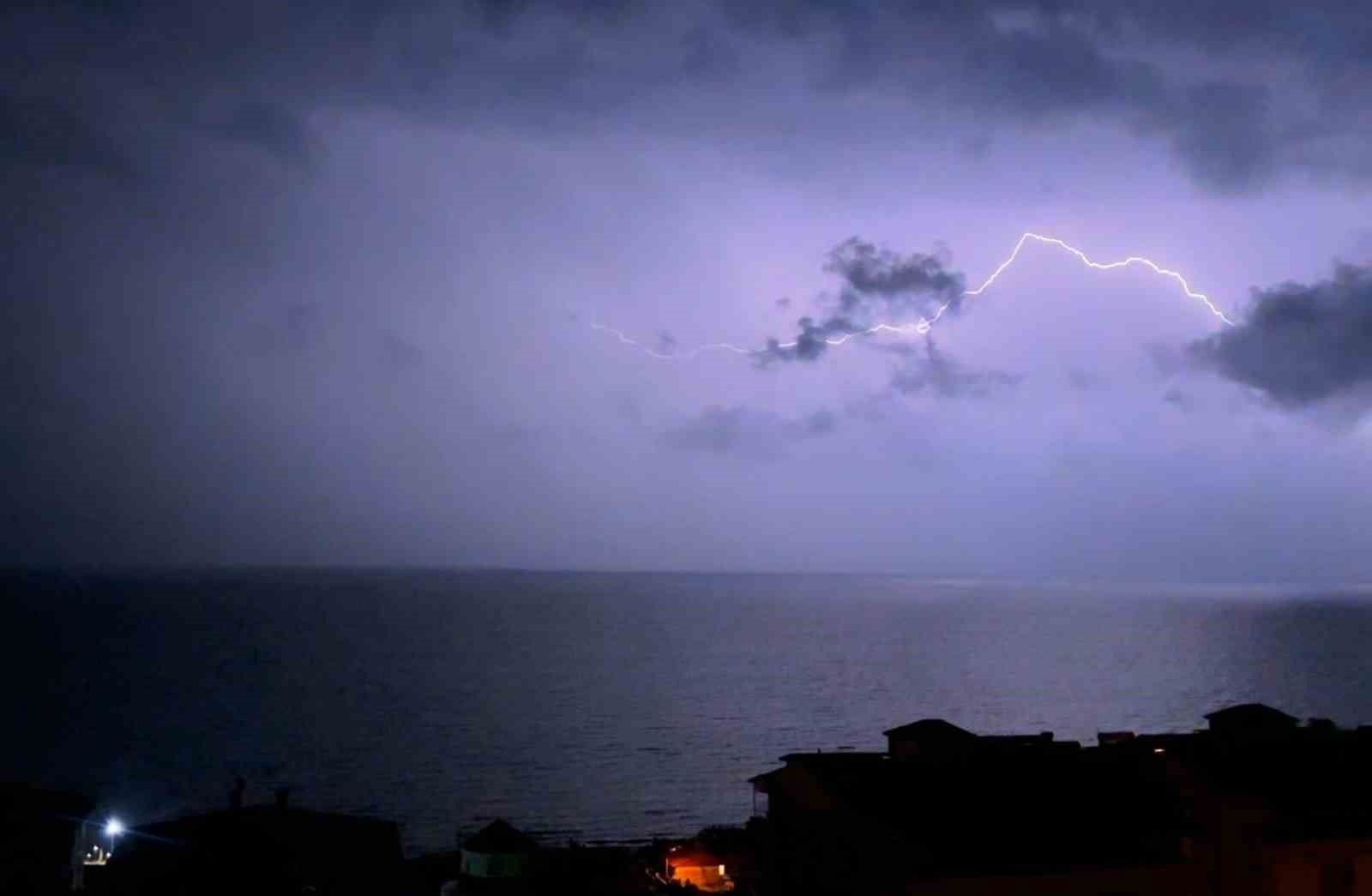 Bitlis'in Ahlat ilçesinde etkili olan gök gürültülü sağanak yağışla birlikte Van Gölü'ne düşen şimşekler adeta geceyi gündüze çevirdi.