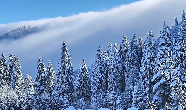 Kayak yapmak için bölgeye gelen ziyaretçiler, karla kaplı ormanların üzerindeki bu etkileyici manzaraya tanıklık etti. Sis denizinin oluşturduğu büyüleyici atmosfer, ziyaretçilere unutulmaz anlar yaşattı.