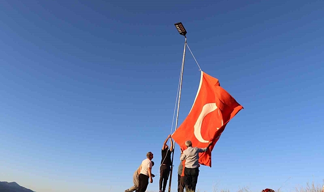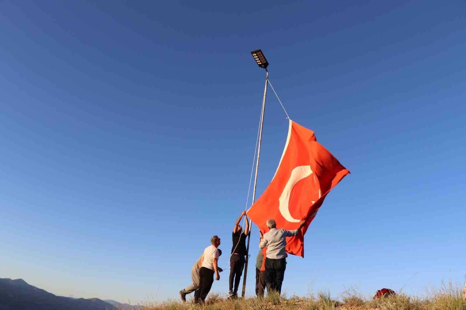 Oltu'nun Sitare Dağı'na şehit öğretmenler için diktikleri bayrak direğinin boyutunu uzatıp güneş enerjili lamba takarak aydınlattılar.