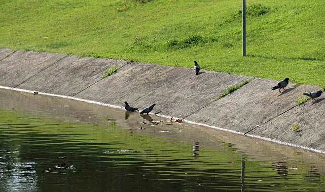 Odunpazarı ilçesi Kurtuluş Mahallesi'nde bulunan Aydın Arat Park'ında sıcak havadan etkilenen güvercinler Porsuk Çayı kenarında serinlemeye çalıştı. Sevimli kuşlar hem su içip hem de zaman zaman Porsuk Çayı'na girdiği görüldü. 35 dereceye kadar çıkan hava sıcaklıklarında kuşlar güzel manzaralar oluşturdu.