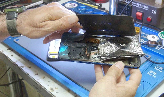 Olay, ilçenin Şehit Summani Görgen Caddesi üzerinde bulunan Yusuf Altındaş'a ait telefon satış ve tamirinin yapıldığı dükkanda meydana geldi. Güvenlik kamerasına yansıyan görüntüde telefon tamircisi Yusuf Altındaş'ın tamir ettiği telefonun bataryası bir anda alev alarak patladı.