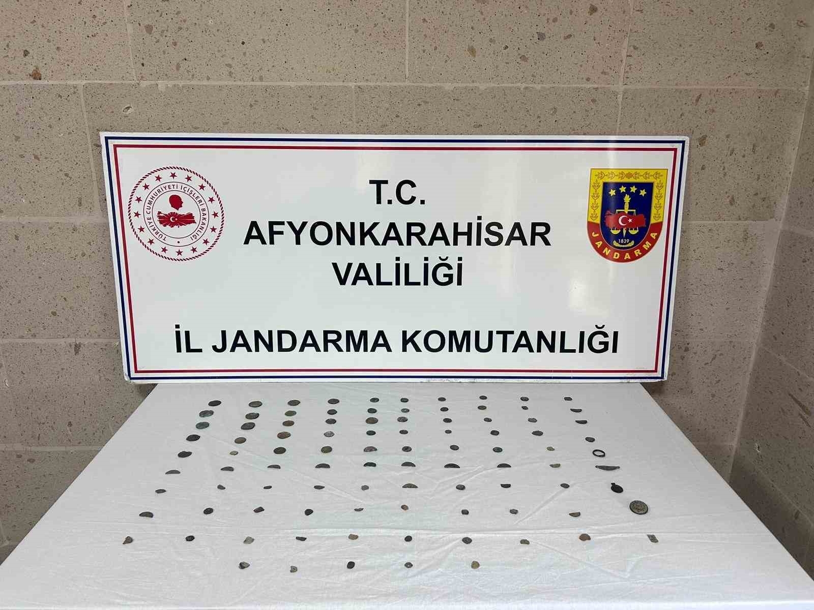 Afyonkarahisar'da elinde bulunan ve tarihi eser niteliği taşıdığı düşünülen 95 adet sikkeyi satmak isteyen şahıs jandarma tarafından gözaltına alındı.