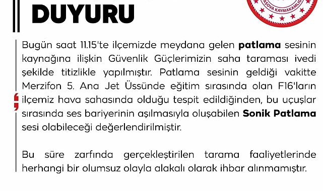 Kaymakamlık tarafından yapılan bu açıklama ile ilçe sakinlerinin yaşadığı tedirginlik giderilmiş oldu. Patlama sesinin, askeri jetlerin ses bariyerini aşması sonucu ortaya çıkan sonik patlama olduğu belirtildi.