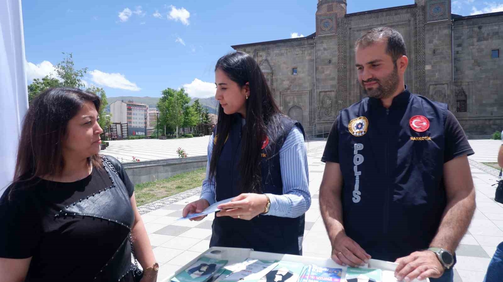 26 Haziran Dünya Uyuşturucu Kullanımı ve Kaçakçılığıyla Mücadele Günü çerçevesinde, Erzurum Emniyet Müdürlüğü Narkotik Suçlarla Mücadele Şube Müdürlüğü ekiplerince Çifte Minareli Medrese önünde stant açılarak vatandaşlara bilgilendirme yapıldı ve broşür dağıtıldı.