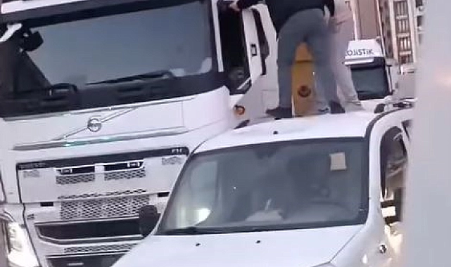 Bir araç sürücüsü ile tır şoförü arasında yol verme nedeniyle trafikte tartışma çıktı. Tartışmanın büyümesi üzerine otomobildeki iki kişi, araçtan inerek tırın tavanına çıktı. Tır şoförüne tekmelerle saldıran şahısların o anları ise bir vatandaşın cep telefonu kamerasına yansıdı.
