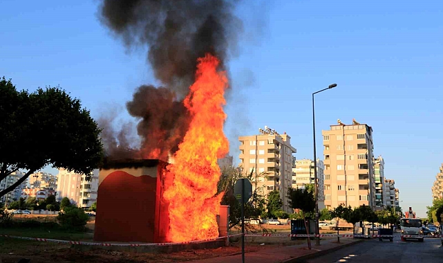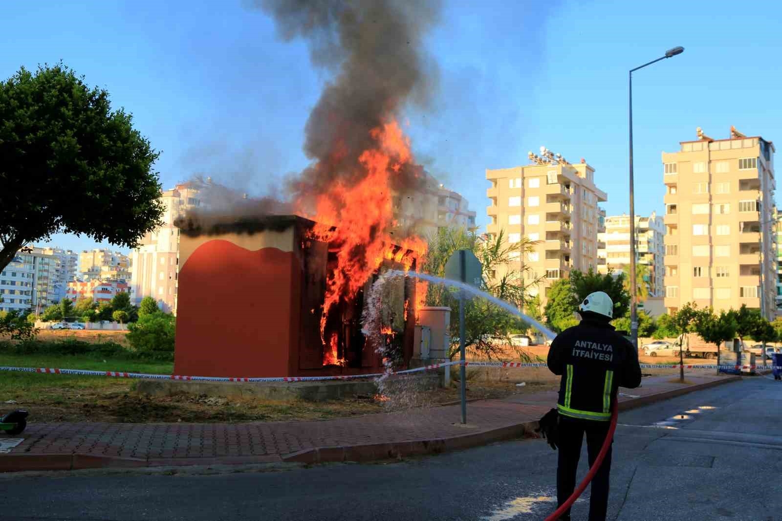 Antalya'da park içerisinde bulunan trafoda başlayan yangın kısa sürede büyüdü. Önce patlamaların yaşandığı trafo kısa süre içinde alevler içinde kalırken trafonun birkaç metre yakınında 2 adet kamyonette bulunan çok sayıda mutfak tüpü güvenli bir yere taşındı.