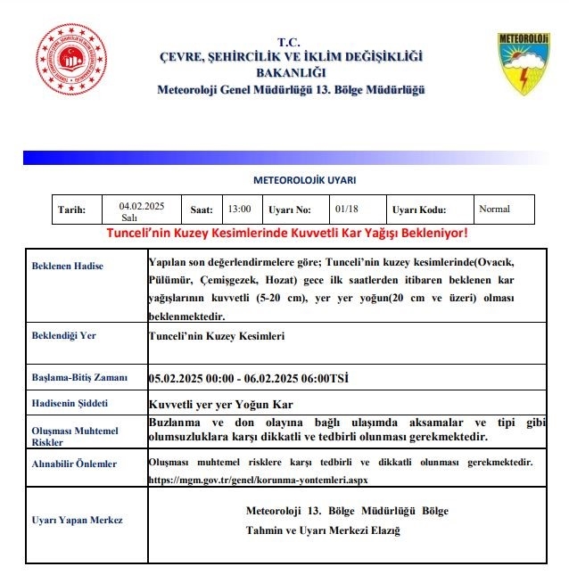 Meteoroloji 13. Bölge Müdürlüğü'nden yapılan açıklamada, "Yapılan son değerlendirmelere göre; Tunceli'nin kuzey kesimlerinde (Ovacık, Pülümür, Çemişgezek, Hozat) gece ilk saatlerden itibaren beklenen kar yağışlarının kuvvetli (5-20 cm), yer yer yoğun (20 cm ve üzeri) olması beklenmektedir" denildi.