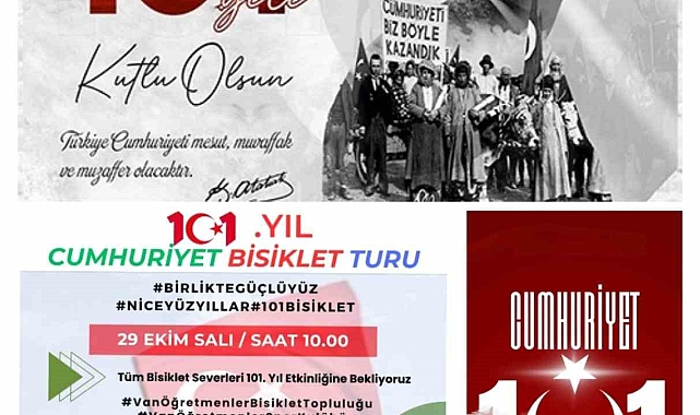 Van Öğretmenler Bisiklet Topluluğu, 29 Ekim Cumhuriyet Bayramı kutlamaları çerçevesinde 29 Ekim Salı günü Türkiye Cumhuriyeti'nin 101'inci yılı münasebetiyle 'Cumhuriyetimizin 101. Yılında 101 Pedal' etkinliği düzenliyor.