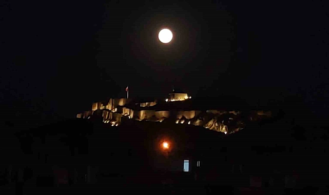 Van semalarında yükselen dolunay, tarihi Van Kalesi'nin siluetiyle birleşerek izleyenlere büyüleyici bir görsel şölen sundu.
