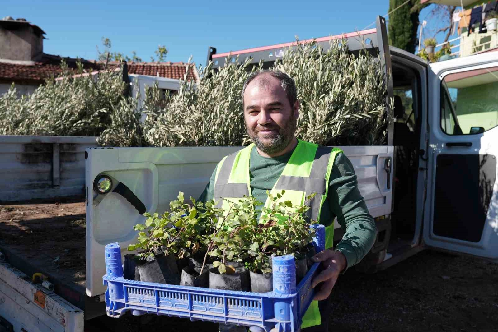 Antalya Büyükşehir Belediyesi, Temmuz ayında Serik ilçesi Yumaklar Mahallesi'nde çıkan yangında bahçeleri zarar gören üreticilere zeytin ve keçi boynuzu fidanı hibe etti.