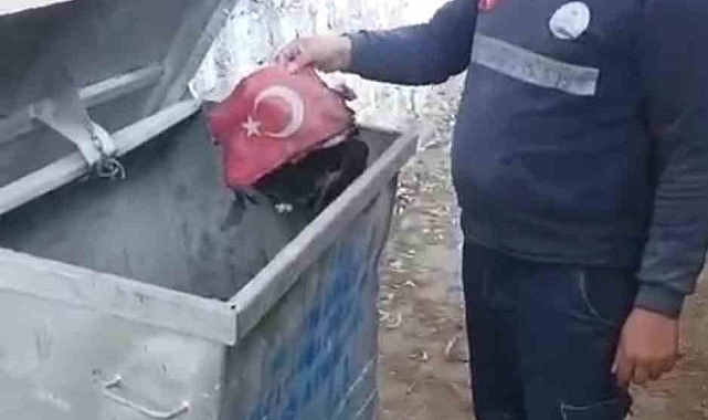Adana'nın Kozan ilçesinde temizlik görevlisi, ateş yakılan çöp konteyneri içindeki Türk bayrağını alarak yanmasının önüne geçti.