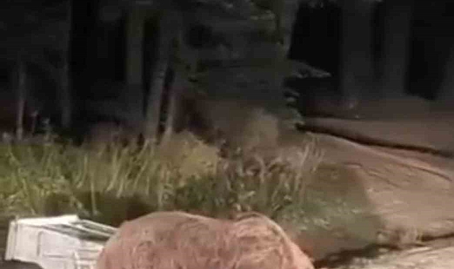 Bursa'da acıkan ayı Uludağ'ın turistik bölgesi olan Sarıalan'da çöp konteynerlarında yemek ararken, ayıyı çeken bir vatandaş o anları şarkı söyleyerek izledi. Verdiği mini konseri kayda alan kişi izleyenleri gülümsetti.