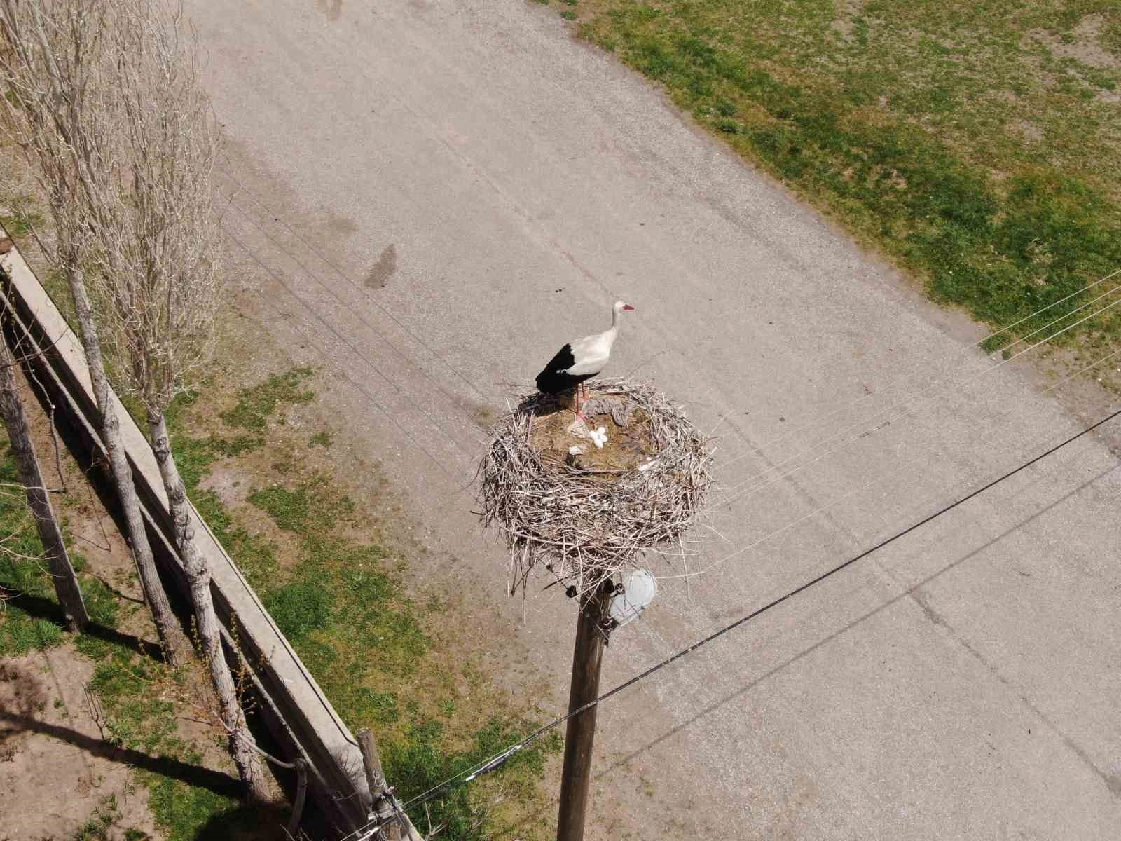 Baharın gelmesi ile birlikte Van Gölü havzasına gelen leylekler yuvalarında kuluçkaya yattı. Özalp ilçesinde bağlı Yukarı Dönerdere Mahallesi'ndeki elektrik direğine yaklaşık 48 yıldır gelip yuva yapan leylekler, bu sene de yuvalarına geldi. 4 yumurtası bulunan 2 leyleğin ise uçan dronu gördüğünde verdiği tepki dikkat çekti. Leylek dronu görünce yumurtalarının üzerine yatarak korumaya çalıştı. Yumurtalarını yalnız bırakmayan leylekler, karınlarını doyurmak için nöbetleşe bölgedeki sulak alanlara gidiyor. Böcek ve sürüngenlerin yanı sıra balıkla beslenen leylekler, sulak alanda anbean kaydedildi.